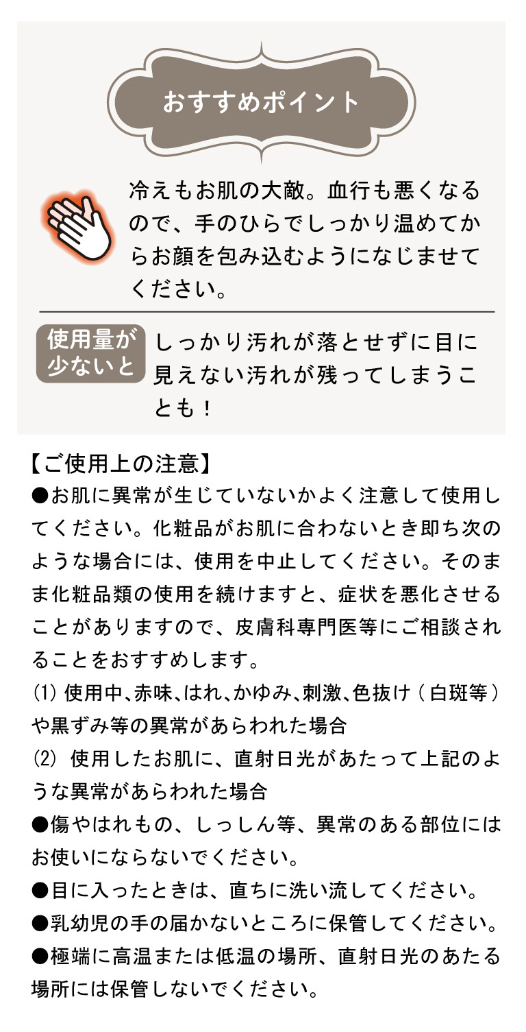 ●お肌に異常が生じていないかよく注意して使用してください。化粧品がお肌に合わないとき即ち次のような場合には、使用を中止してください。そのまま化粧品類の使用を続けますと、症状を悪化させることがありますので、皮膚科専門医等にご相談されることをおすすめします。(1)使用中、赤味、はれ、かゆみ、刺激、色抜け(白斑等)や黒ずみ等の異常があらわれた場合。(2)使用したお肌に、直射日光があたって上記のような異常があらわれた場合。