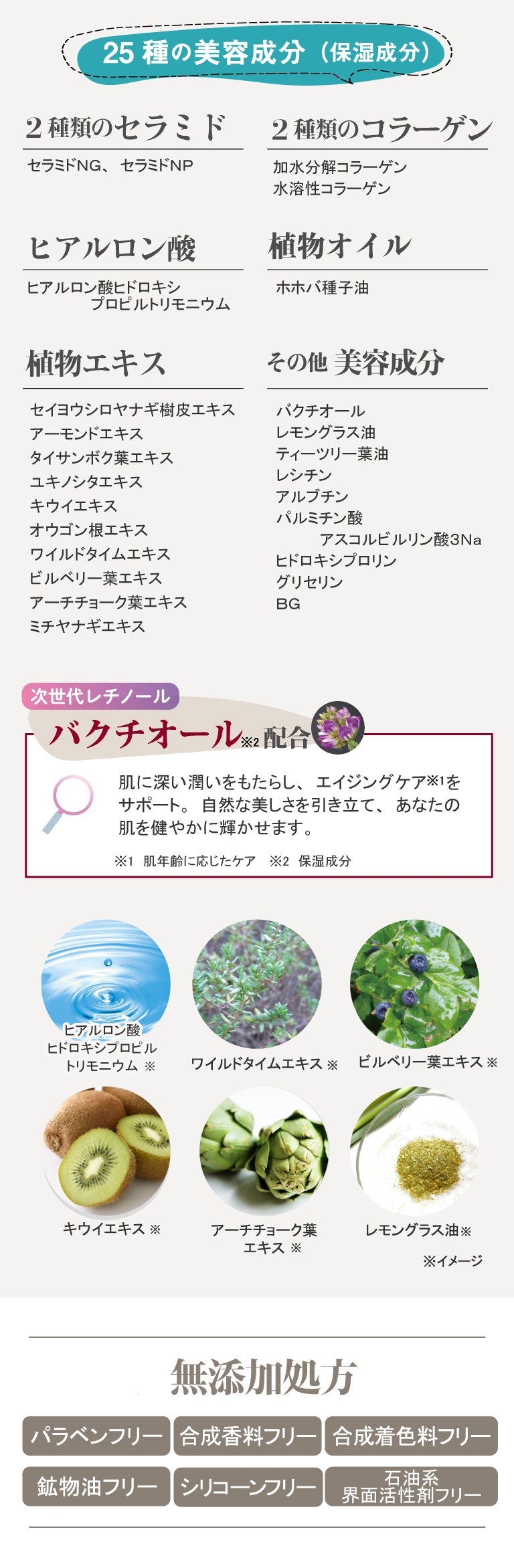 《全成分》水、ナイアシンアミド、BG、ペンチレングリコール、グリチルリチン酸2K、セラミドAP、セラミドEOP、セラミドNG、セラミドNP、ヒアルロン酸Na、エチルヘキシルグリセリン、エリスリトール、ビオサッカリドガム―1、フィトステロールズ、ベタイン、ポリグリセリン-3、キサンタンガム、タマリンドガム、ヒドロキシエチルセルロース、水添レシチン、PEG-60水添ヒマシ油、ペンテト酸5Na、クエン酸、クエン酸Na、フェノキシエタノール