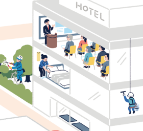 ホテルやレジャー施設で過ごす時間は、特別なひととき。そんな空間をもっと快適にするため、客室清掃や庭木管理、ビルメンテナンスなどを行っています。訪れる人が『ここに来てよかった』と思えるように、細やかなサービスで施設の魅力を引き出します。