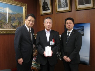 大洲市副市長の松田様(中央)と、レオハウス代表の内村社長(左)、植松エリアMG(右)