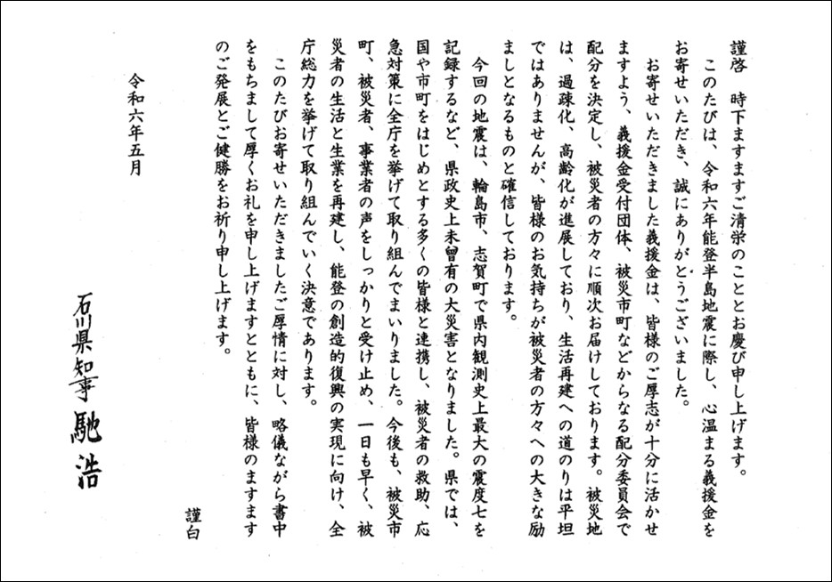 このたびの「令和6年能登半島地震」による被害に遭われた皆様に、心よりお見舞い申し上げます。 ナックグループCSR委員会では、令和6年能登半島地震による被災者の支援及び、 被災地の復興に役立てていただくため義援金を募りました。 集まった金額と同額を会社が上乗せする「マッチングギフト※」による義援金を拠出し、 総額1,879,984円を石川県へ寄付しました。 被災地の一日も早い復旧を、心からお祈り申し上げます。 ※企業が社員等に社会貢献を目的とする寄付金や義援金を募る際、集まった金額と同額もしくは一定額を会社が上乗せして寄付する制度